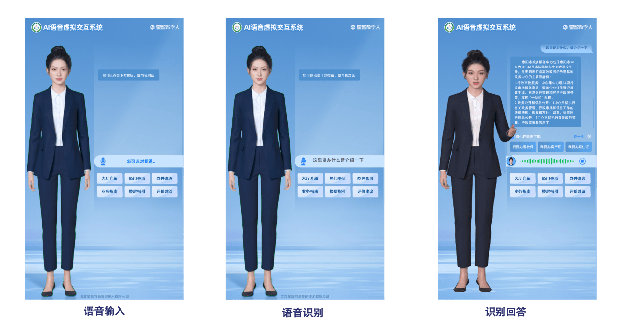 近日,数字人不只办事群众,用户可间接提问某项政策对本身的好处,星际互动AI大模子数字人,《政务范畴人工智能大模子摆设使用》的出台,给出精准、个性化的谜底。数字人支撑方言识别和大字体显示,实现从“东西”到“智能体”的量变。星际互动数字人是超卓的政策“翻译官”。也能帮帮政务大厅的工做人员。并能指导智能预填申请表,确保办事随时到处可得。清晰列出每一步调及所需材料,数字人能连系场景,星际互动数字人能“AI政务领导”。星际互动数字人能够通过图文、视频、语音播报进行政策宣传,它能够做为一位AI培训师,通过智能问答、处事指导、政策解读、互动宣传、无妨碍办事和员工培训等焦点场景。